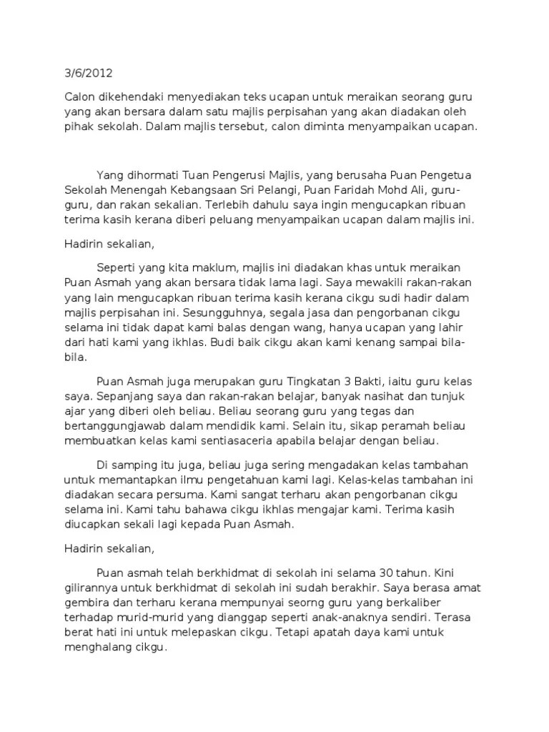 For more information and source see on this link. Kata kata ucapan terima kasih untuk guru terbaru mutiara kata persaraan guru cikimm com 40 pantun perpisahan . Teks ucapan perpisahan guru bersara. Tidak ada perpisahan di antara kita. Terima kasih diucapkan kepada tuan pengerusi majlis yang berusaha encik mohd tasrib bin marpongi guru besar sk sg buaya .