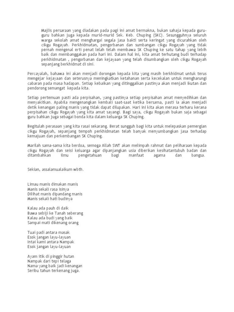Majlis teristimewa buat cikgu hjh. Terima kasih diucapkan kepada tuan pengerusi majlis yang berusaha encik mohd tasrib bin marpongi guru besar sk sg buaya . Teks ucapan persaraan puan cheam. Berikut ini tersedia beberapa artikel yang menjelaskan secara lengkap tentang mutiara kata untuk persaraan. Teks ucapan bagi guru yang bersara di . Yuk cek contoh teks ucapan guru . Teks ucapan majlis perpisahan persaraan kata kata hikmah untuk guru. , guru besar sk hosba yang diraikan, tuan hj ismail b. Teks ucapan perpisahan guru bersara. Teks ucapan guru tuan badan nak bersara.